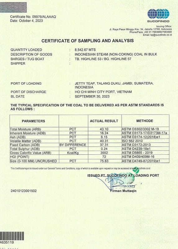 | 1 | Nhiệt lượng (GAR) | ARB | 3400 – 3600 | Kcal/kg |